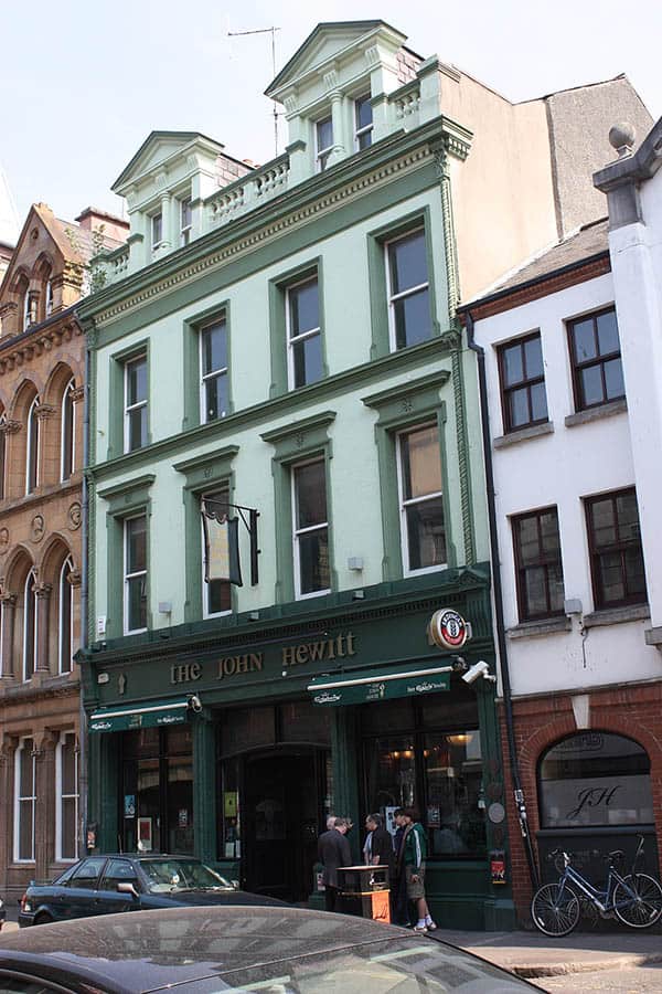 Im Jahr 1983 eröffnete der aus Belfast stammende Dichter John Hewitt eine Hilfseinrichtung zur Unterstützung von Arbeitslosen. Um die notorisch geringe finanzielle Ausstattung der Einrichtung zu sichern, eröffnete das Belfast Unemployment Resource Centre Mitte der Neunziger eine eigene Bar. Hierbei wählte man den Namen des Gründers als Namen der Bar. Diese bietet in typischer Pub-Atmosphäre die gängigen Getränke sowie ein Mittagsmenü. Die The John Hewitt Bar liegt im Cathedral Quarter von Belfast.